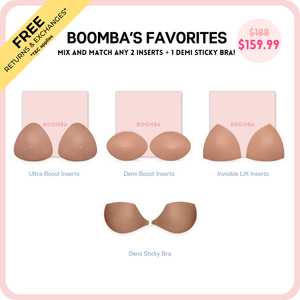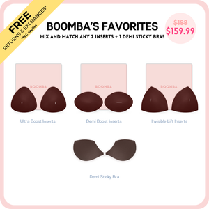 This bundle contains 2 of our best-selling inserts of your choice and the BOOMBA Demi Sticky Bra. Hand-picked as our personal faves, this bundle includes all the essentials you need to look great and feel great on any occasion.