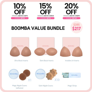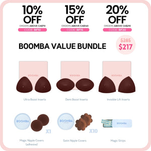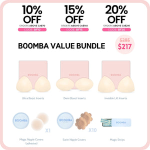 This bundle contains all three styles of our popular inserts, Ultra Boost, Demi Boost, and Invisible Lift. It also contains our best-selling Magic Nipple Covers (adhesive), Satin Nipple Covers, and BOOMBA Magic Strips.