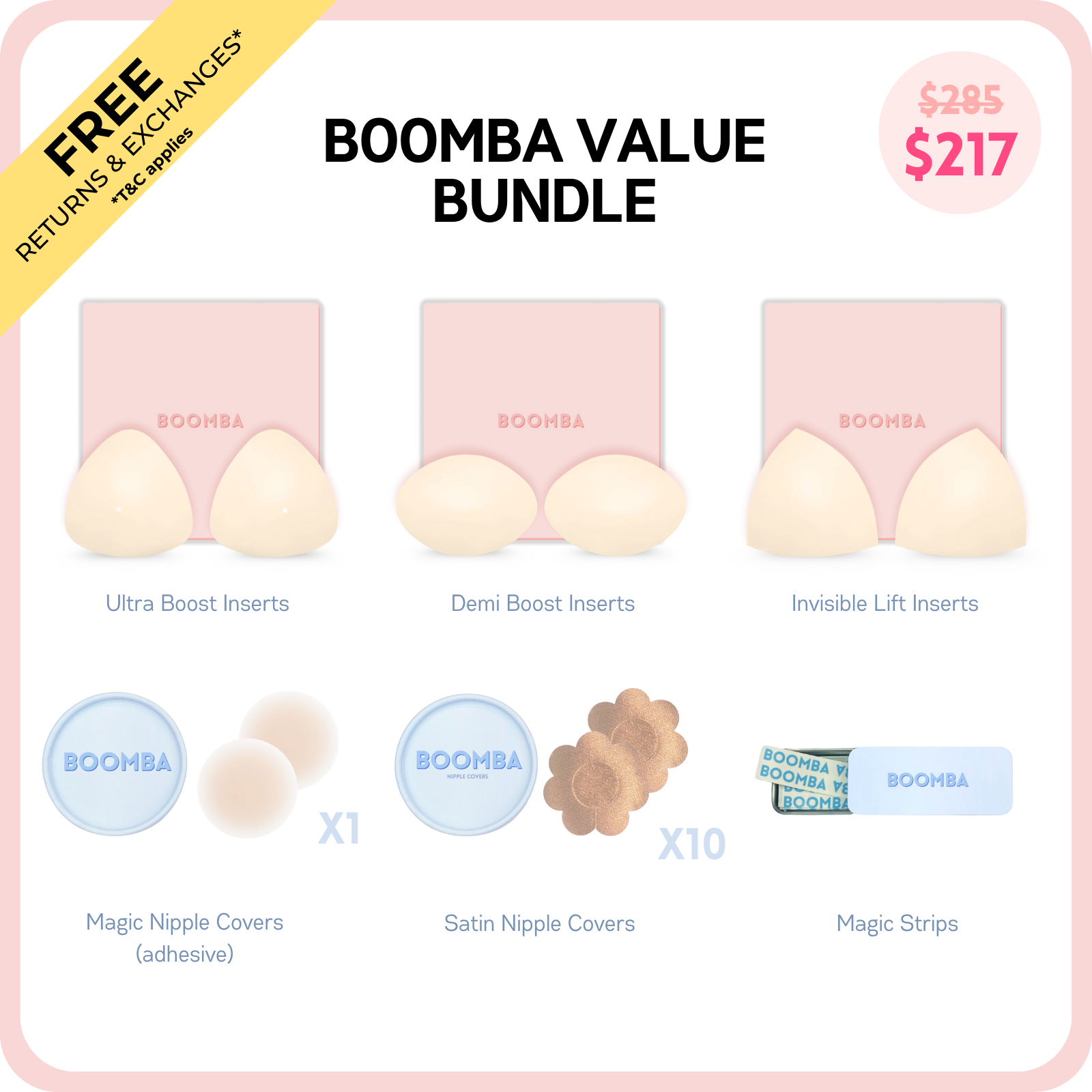Ce lot contient les trois styles de nos coques populaires, Ultra Boost, Demi Boost et Invisible Lift. Il contient également nos meilleures ventes Cache Tétons Magic (adhésif), Cache Tétons Satin et Ruban Adhésif.