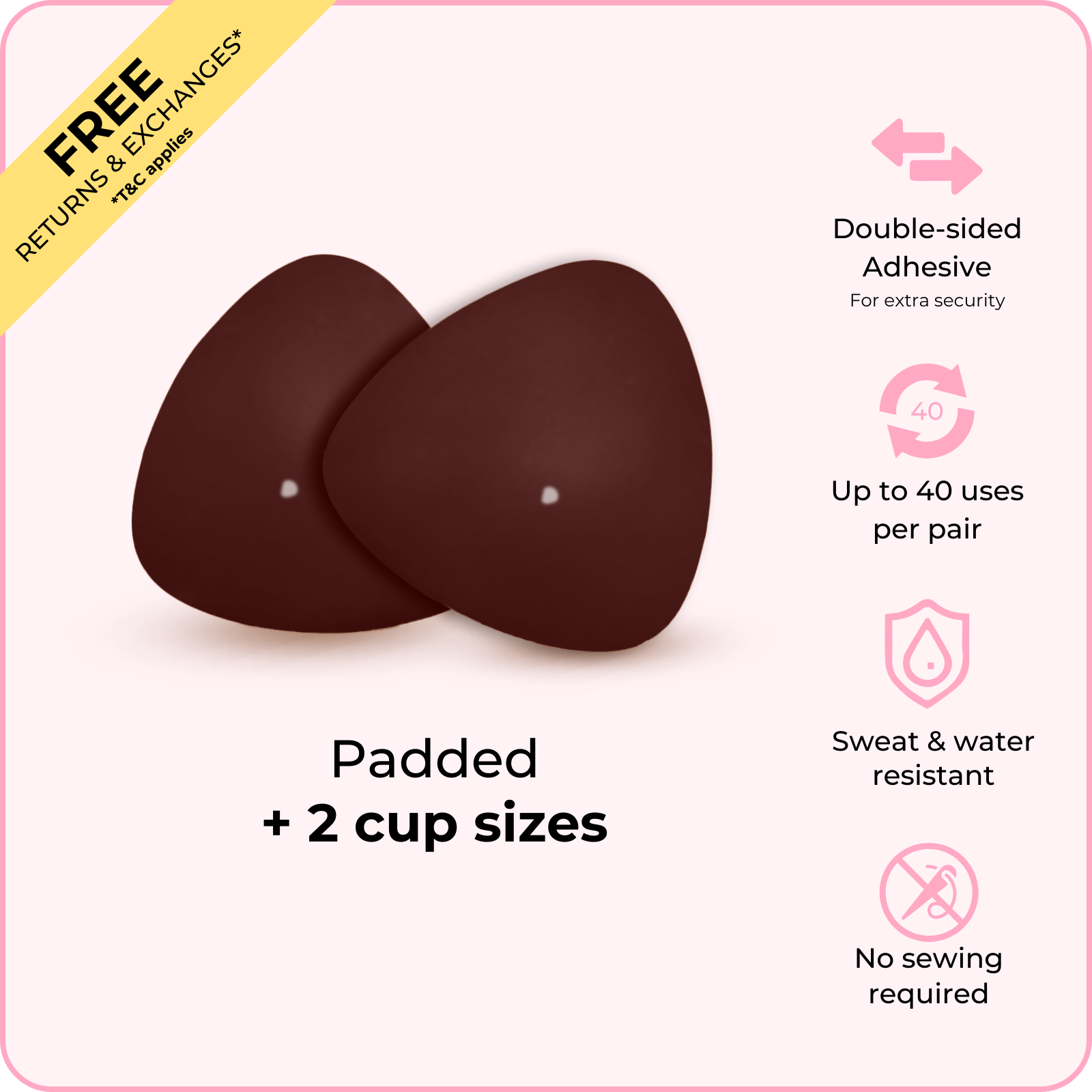 Please note that results may vary depending on breast size and shape. Results will be similar to a double push up bra. BOOMBA’s padded inserts work best with natural breasts.