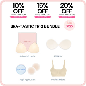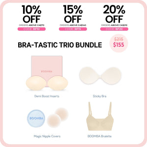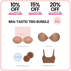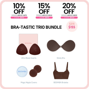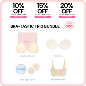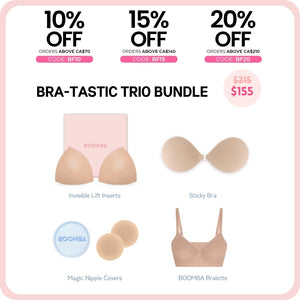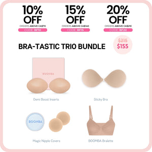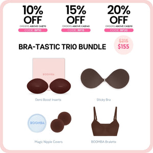 How to Remove: To remove your sticky bra, unclasp and gently peel off one cup at a time, starting from the top outer edge. Reapply protective films onto the sticky bra and store back into the BOOMBA gift box, away from direct sunlight.