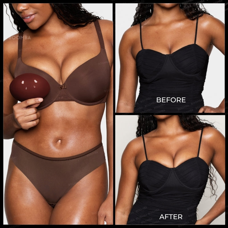 Check out BOOMBA’s Size Guide to find out which size is suitable for your body. Please note that results may vary depending on breast size and shape. Results will be similar to a double push up bra. BOOMBA results work best with natural breasts.