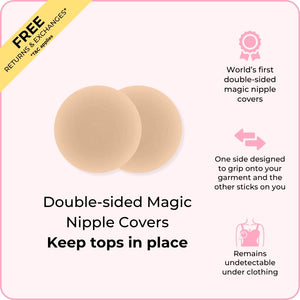 Les premiers Cache-tétons double face au monde, un côté conçu pour se coller sur votre vêtement et l'autre sur vous. Maintient les vêtements en place tout en restant indétectable sous les vêtements.