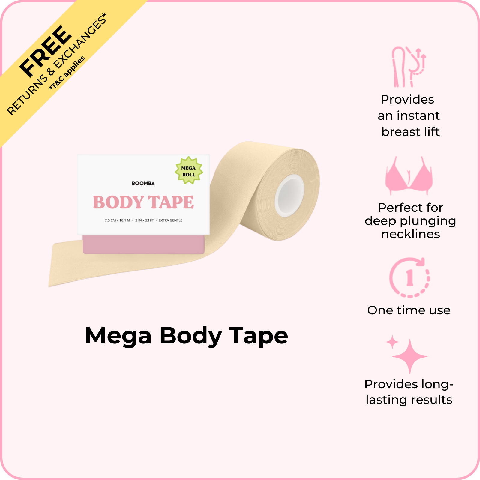 Le ruban adhésif BOOMBA peut être porté de différentes manières. Conçue pour épouser vos formes, notre bande de corps est à la fois douce et résistante et offre des résultats durables pendant 12 heures.