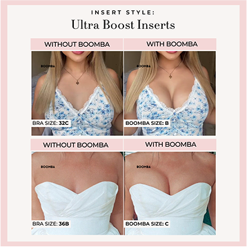 Please note that results may vary depending on breast size and shape. Results will be similar to a double push up bra. BOOMBA’s padded inserts work best with natural breasts.