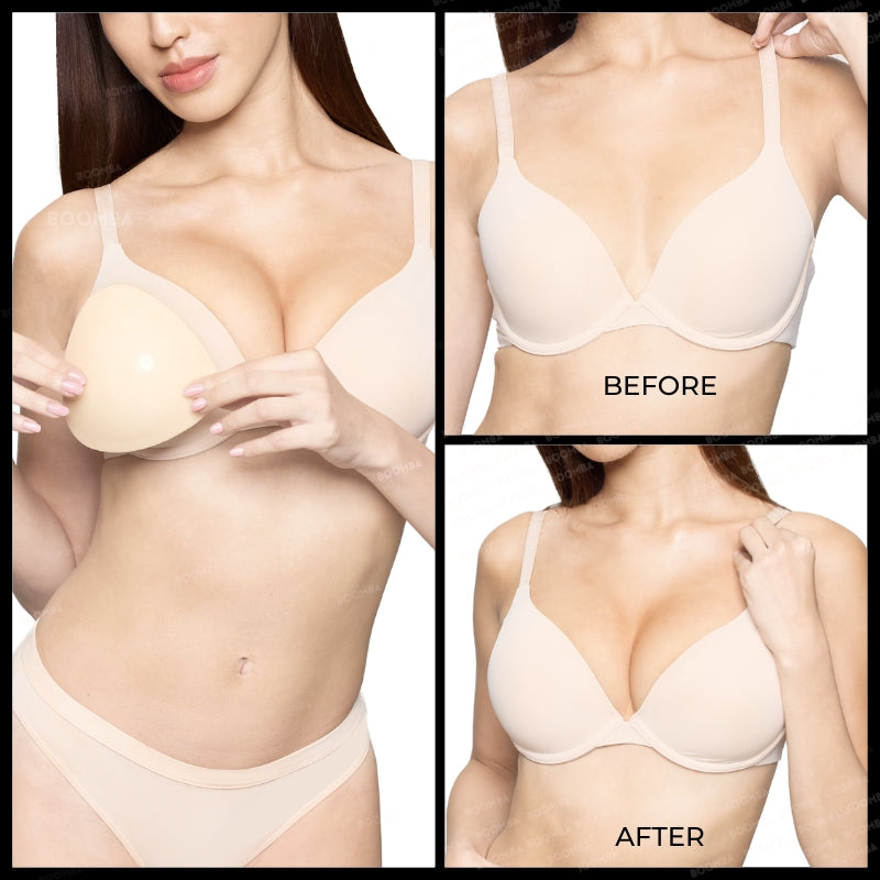 Preparation is key! Before using BOOMBA inserts, please ensure breasts are clean and dry. Any makeup, oil, lotion or other body products may hinder the inserts from sticking onto your skin properly. Put the clothing item on your body first, then place inserts onto the clothing item, then scoop breasts and stick onto the insert to secure.