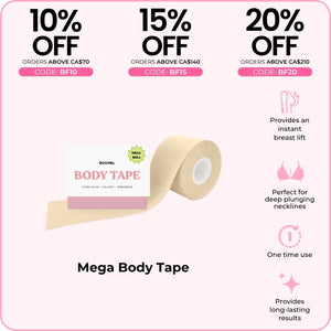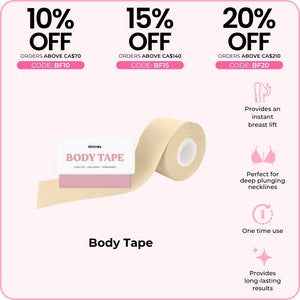 BOOMBA's Body Tape can be worn in various ways. Designed to contour with your shapes, our body tape is gentle yet strong, providing long-lasting results for up to 12 hours.