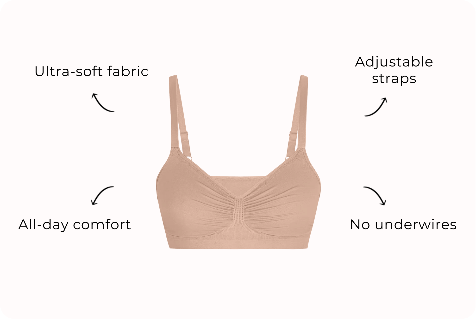 Slip into all-day comfort and effortless style with our bralette. Made from ultra-soft fabric, it provides gentle support without any annoying wires. The seamless design keeps you looking smooth under any outfit, and the adjustable straps ensures your perfect fit.
