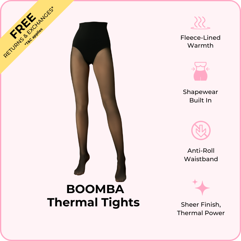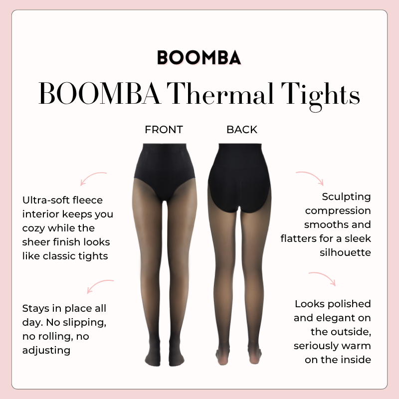 Meet BOOMBA Thermal Tights. Designed to look like your favorite sheer tights, but secretly lined with ultra-soft fleece to keep you cozy all season long. Perfect for layering under dresses, skirts, or oversized sweaters without the bulk.