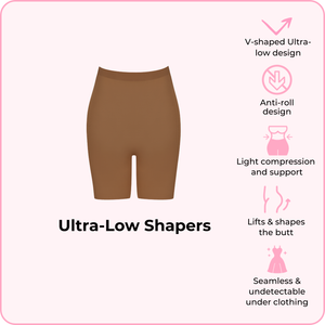 Experience comfort and confidence with BOOMBA’S Ultra-Low Shapers. Featuring a sleek V-shaped Ultra-low cut, this style provides light shaping and support while staying invisible under daring outfits. Ultra lightweight and breathable, this style is perfect for wedding dresses, backless gowns, and everyday wear.