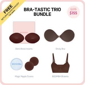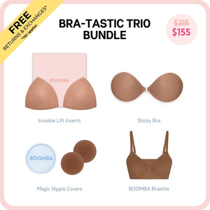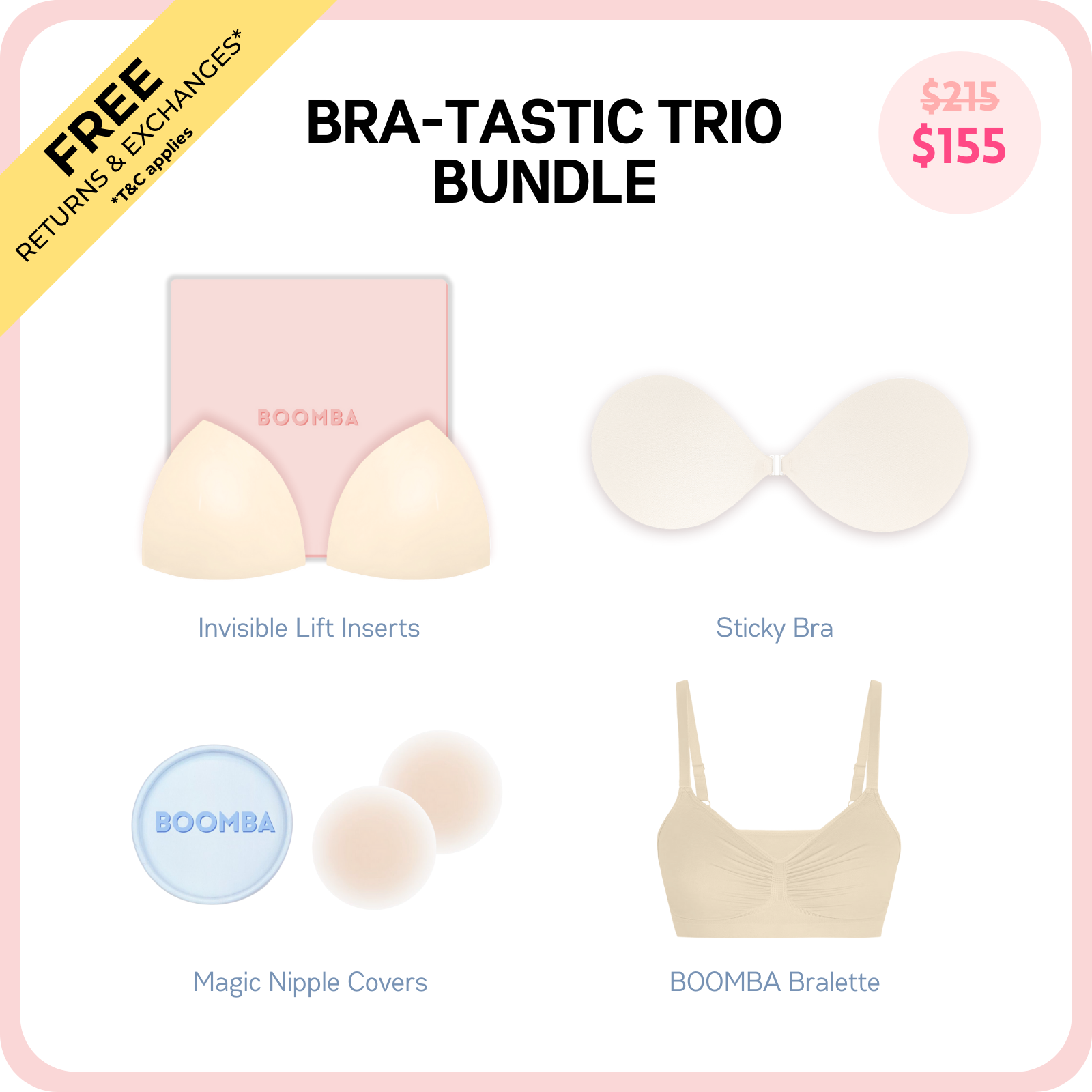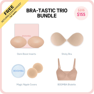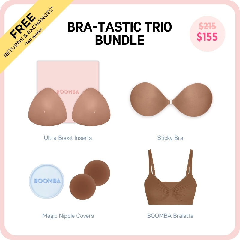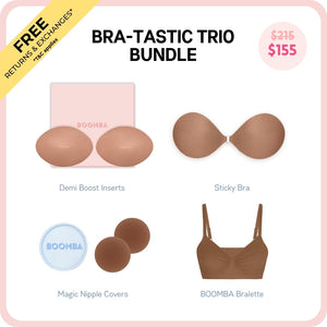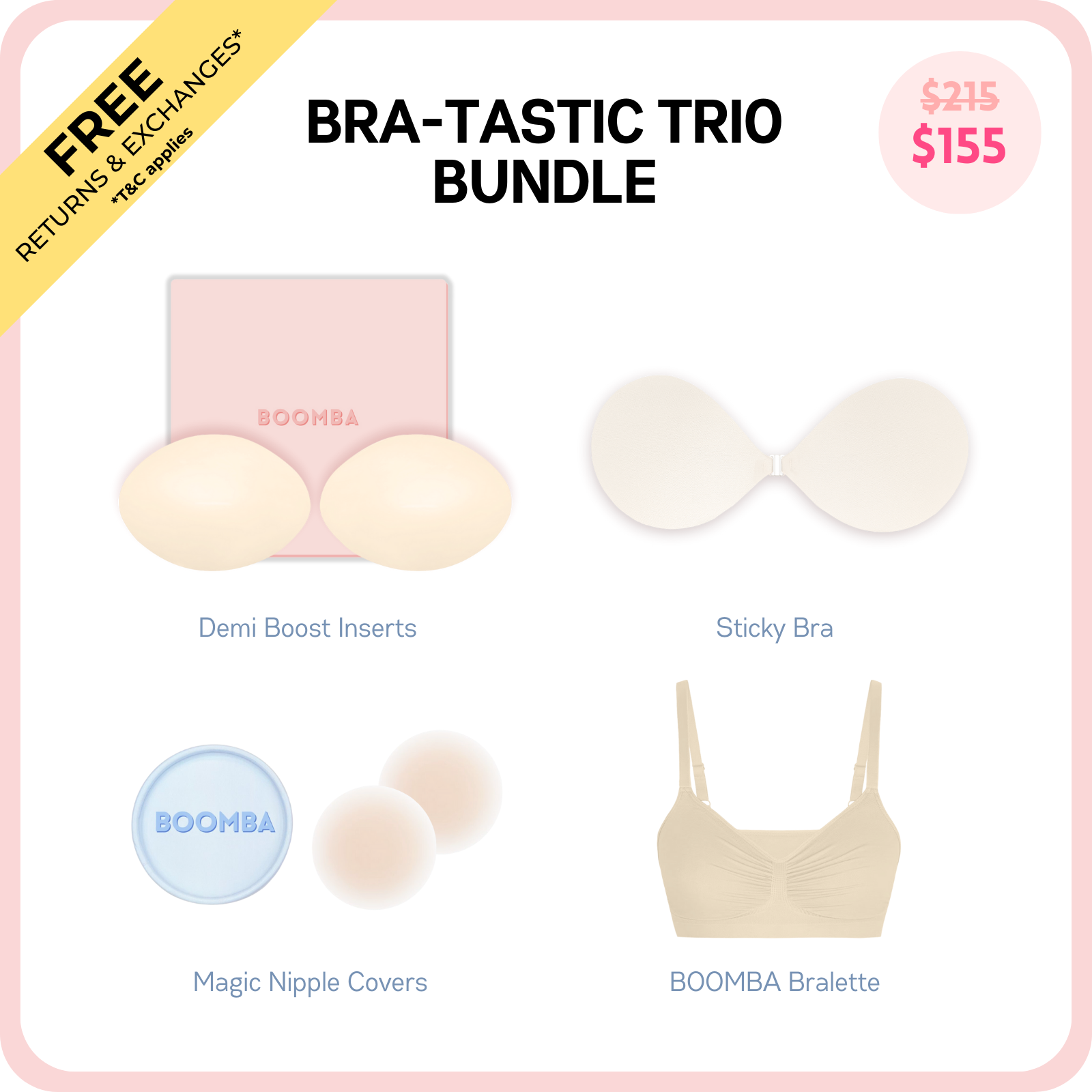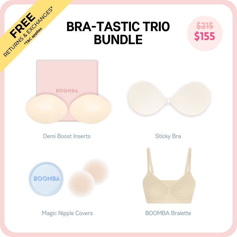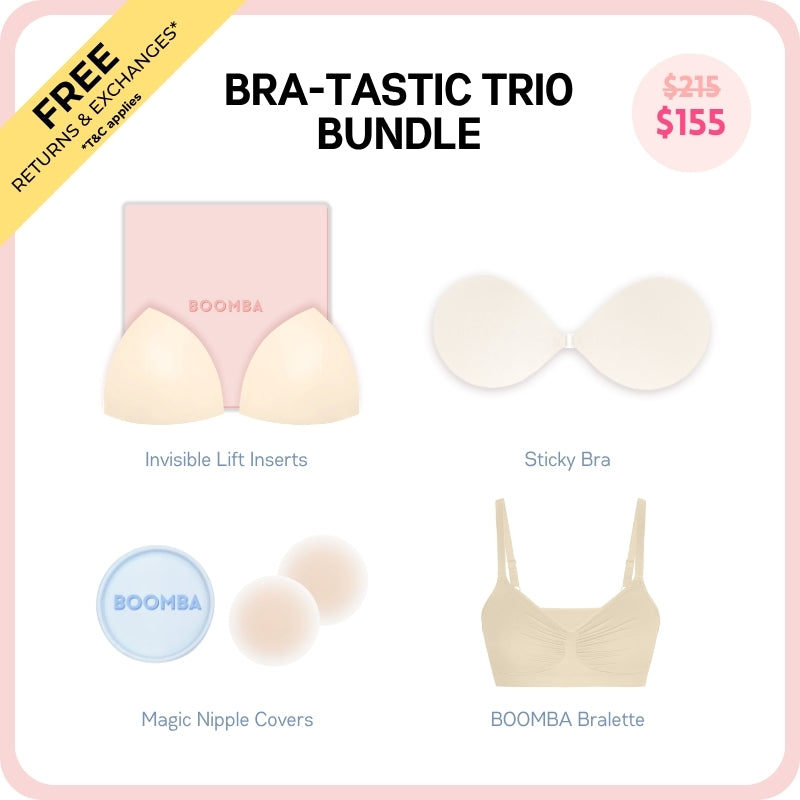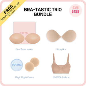 How to Remove: To remove your sticky bra, unclasp and gently peel off one cup at a time, starting from the top outer edge. Reapply protective films onto the sticky bra and store back into the BOOMBA gift box, away from direct sunlight.