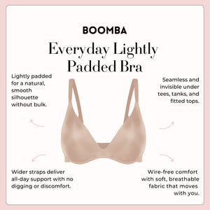 Meet your new daily go-to: The Everyday Bra by BOOMBA. Designed to feel like a second skin, this wireless, lightly padded bra with wider straps delivers the perfect balance of comfort, shape, and support. This is the bra you will want to wear every day, with everything