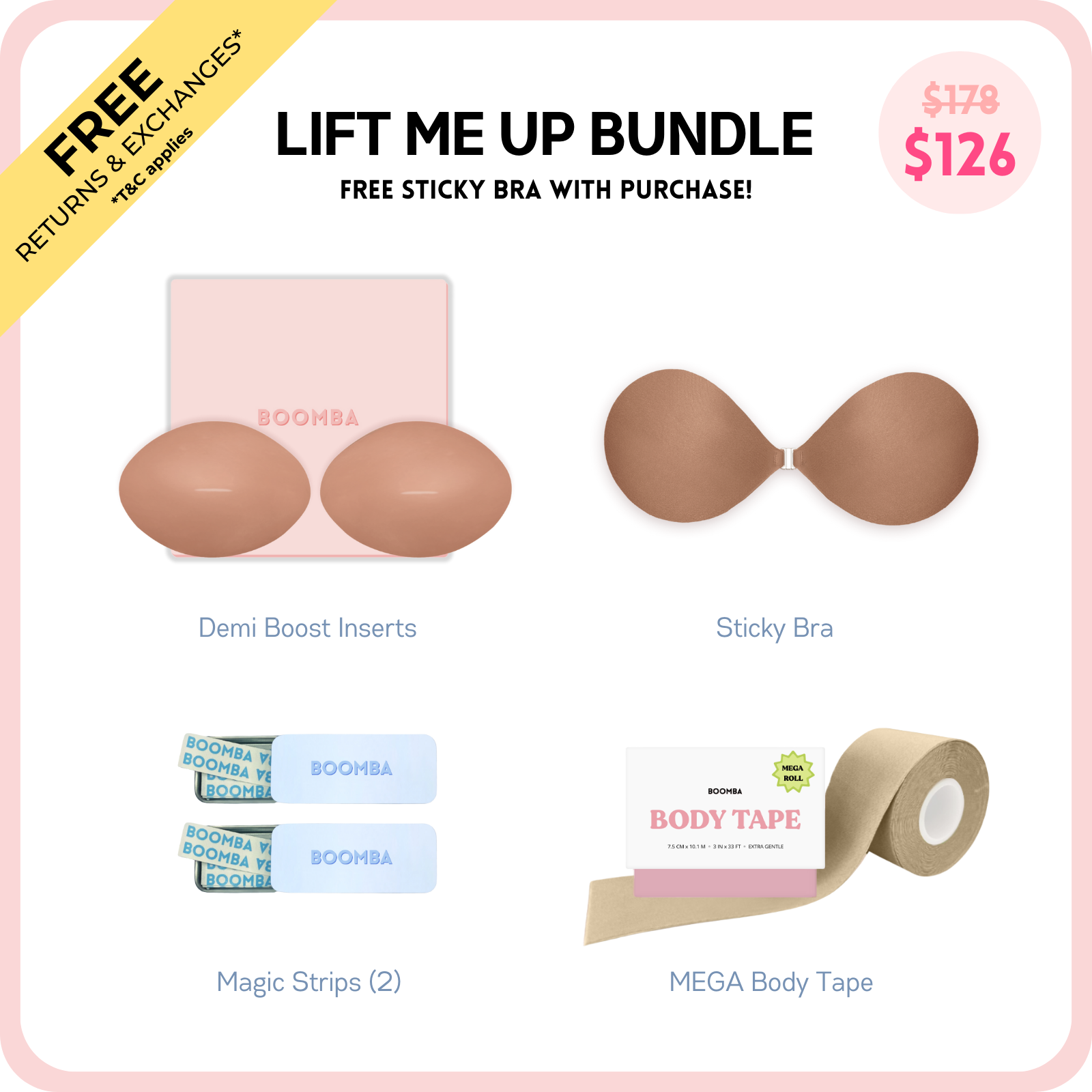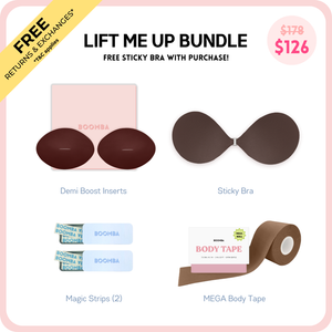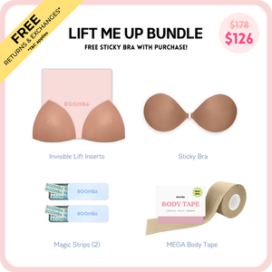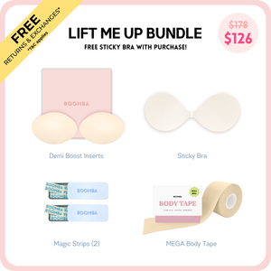 If you're looking for a little more cleavage or just want to add more security to your outfit, this bundle is perfect for you. This bundle includes 1 Pair of Inserts, 1 Sticky Bra, 2 Tins of BOOMBA Magic Strips, and 1 MEGA Body Tape. The bundle will help you have that natural lift and volume.