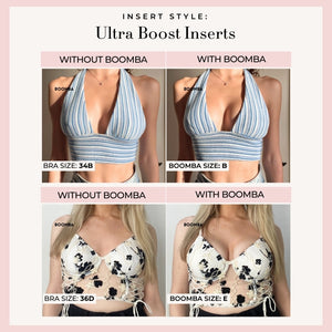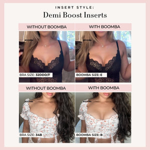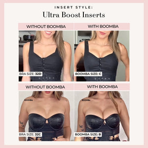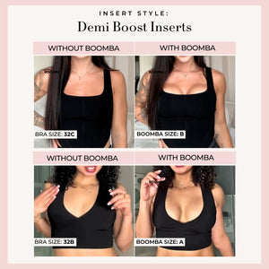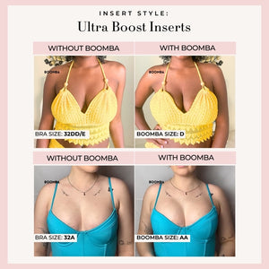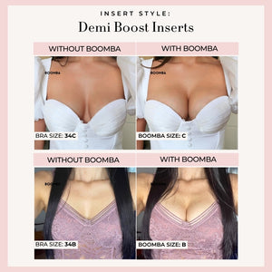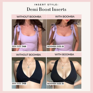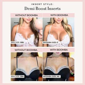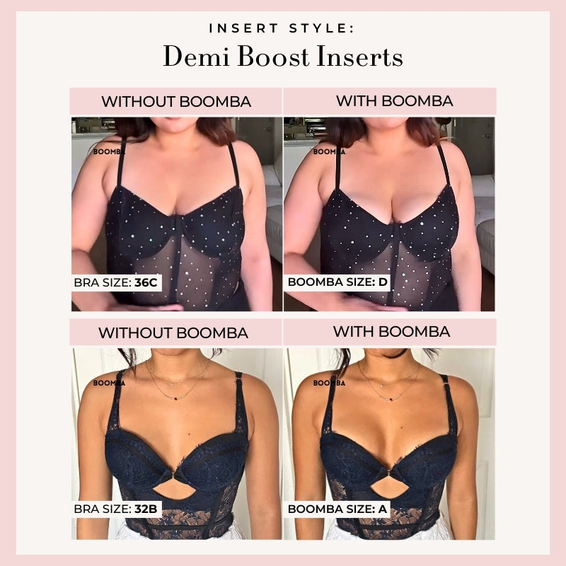 Please note that results may vary depending on breast size and shape. Results will be similar to a double push up bra. BOOMBA padded inserts work best with natural breasts.