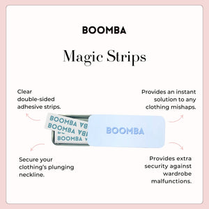 BOOMBA’s Magic Strips are clear adhesive strips that stick on both sides. They stick to your skin and to your clothing discreetly to provide an extra level of security against wardrobe malfunctions. Take the plunge with confidence, just peel, stick and go!