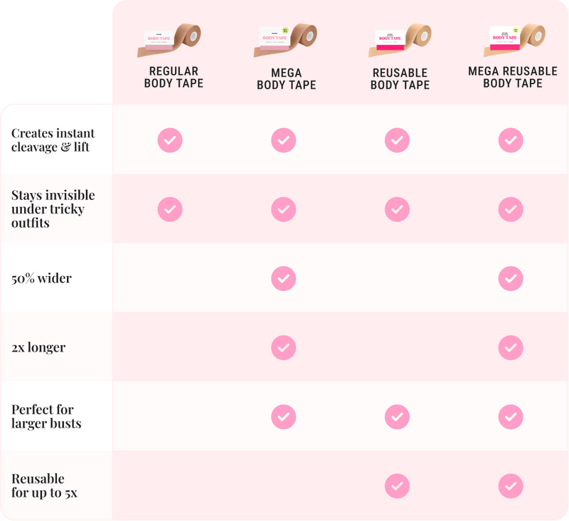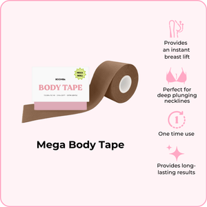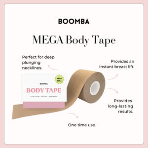BOOMBA's Mega Body Tape can be worn in various ways. Designed to contour with your shapes, our body tape is gentle yet strong, providing long-lasting results for up to 12 hours.