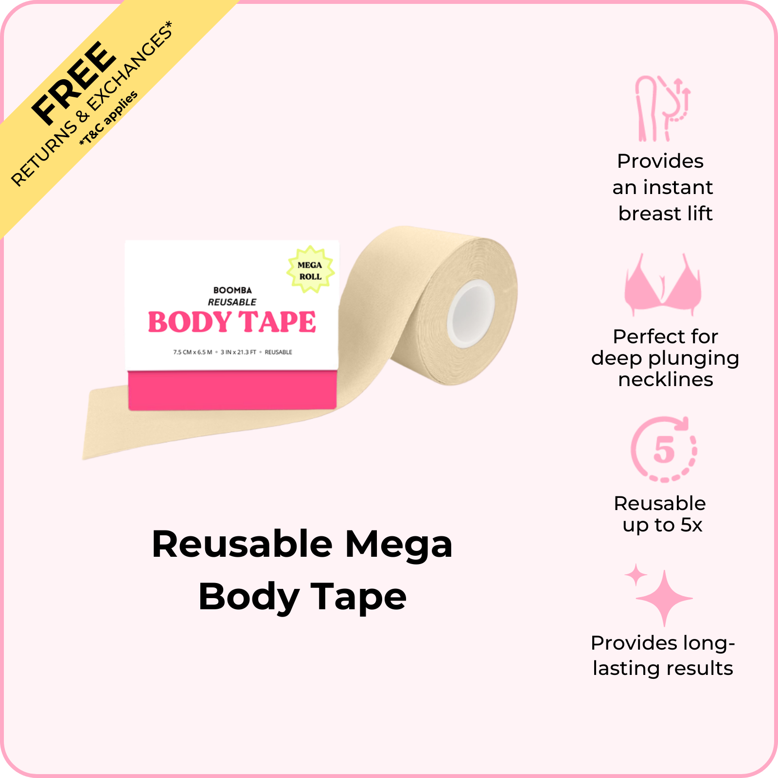 BOOMBA's Reusable Body Tape can be reusable up to five times. Designed to contour with your shapes, our body tape is gentle yet strong, providing long-lasting results for up to 12 hours.