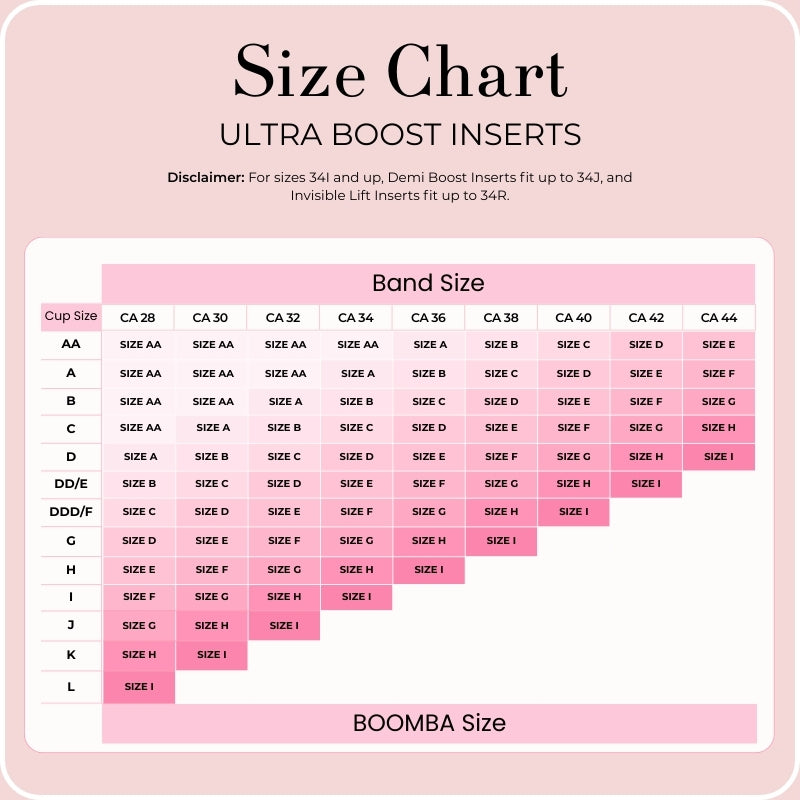 For sizes 34I and up, our Demi Boost Inserts (double push-up) are available in sizes up to 34M and our Invisible Lift Inserts (lightly padded) are available in sizes up to 34R.