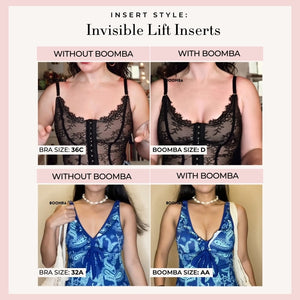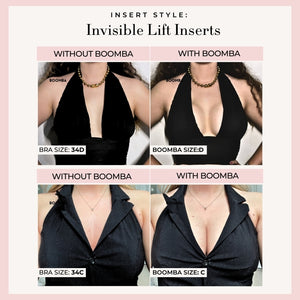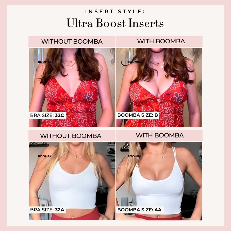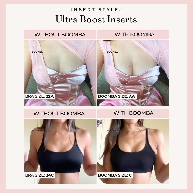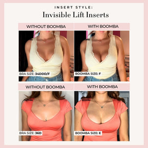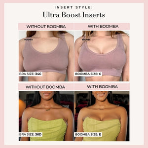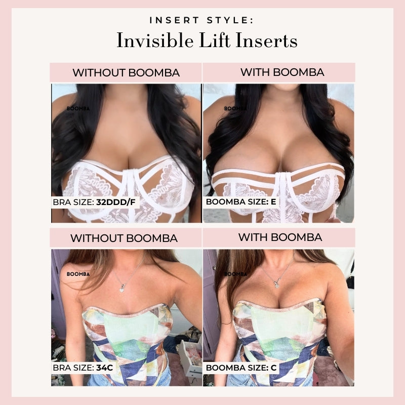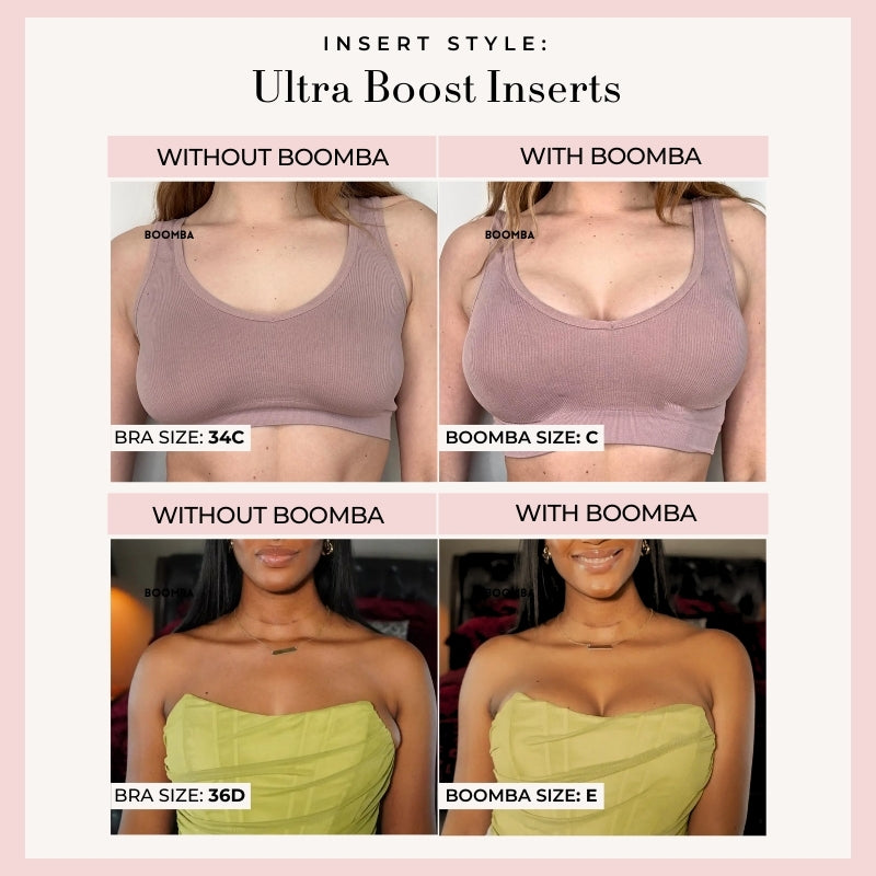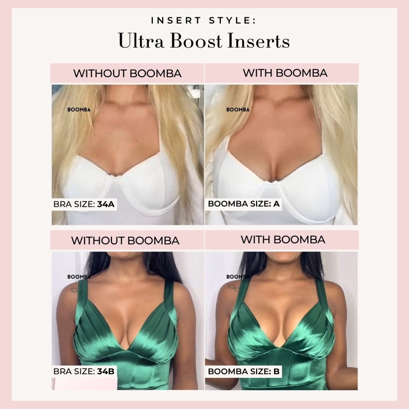 Please note that results may vary depending on breast size and shape. Results will be similar to a push up bra. BOOMBA padded inserts work best with natural breasts.