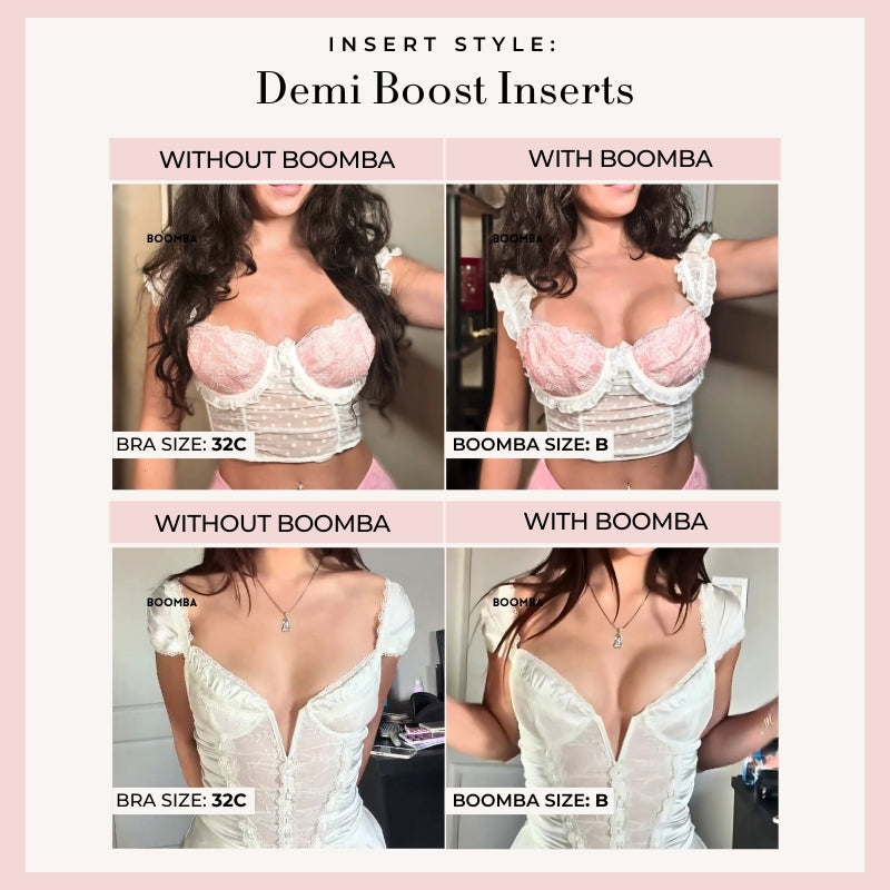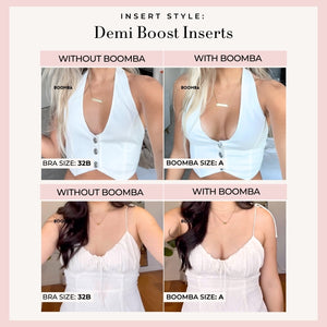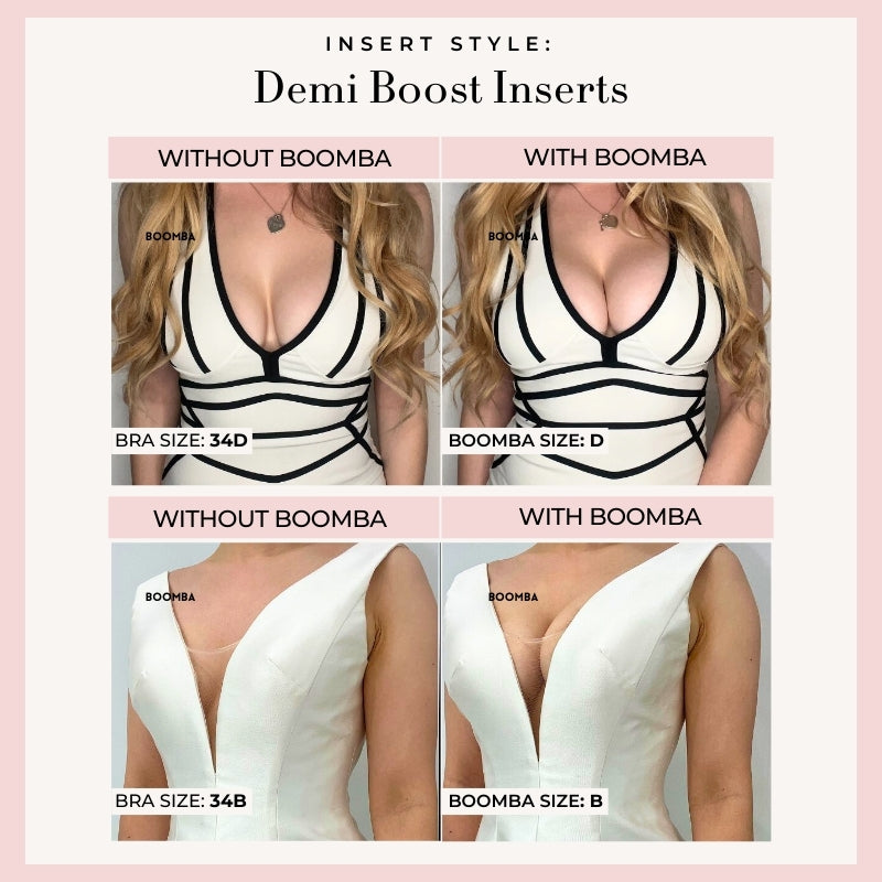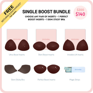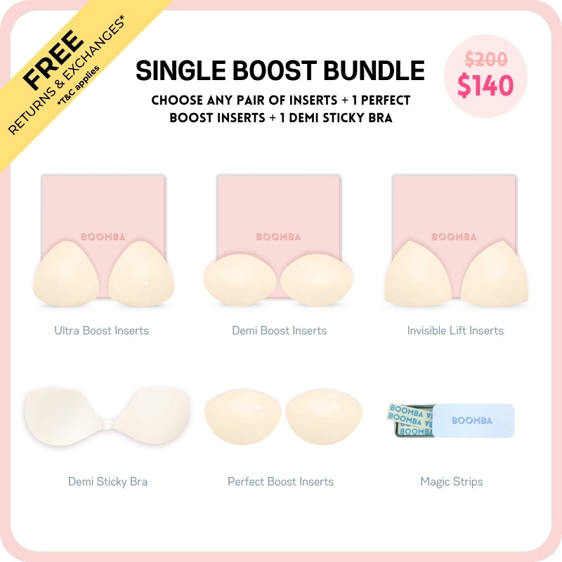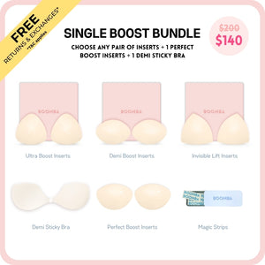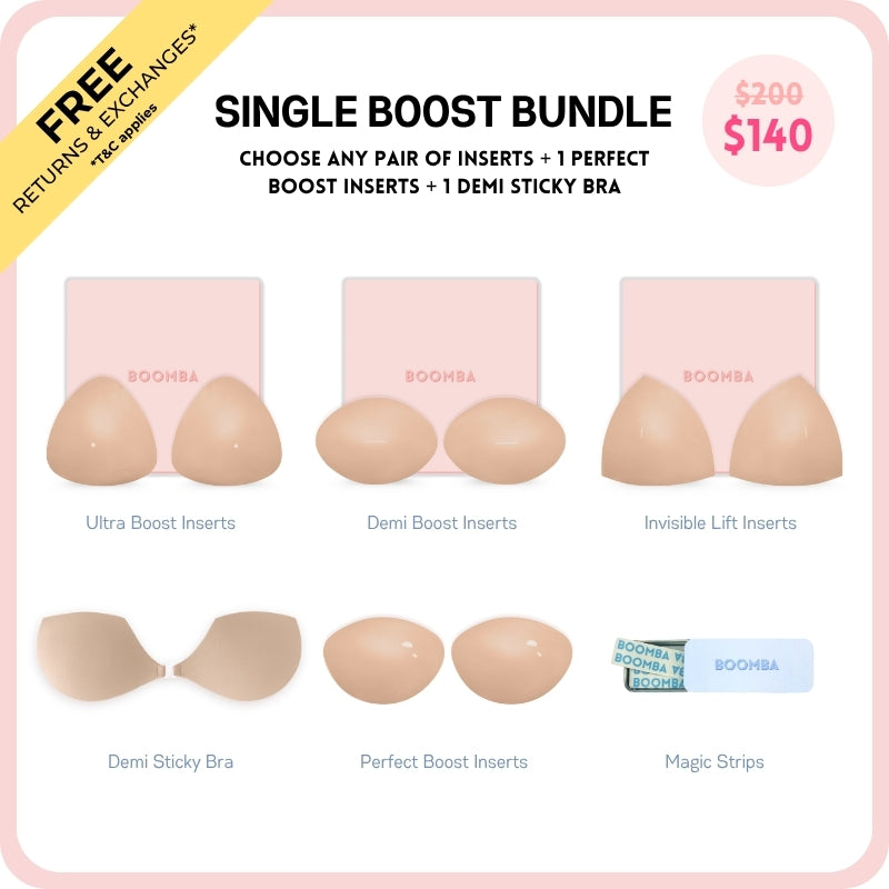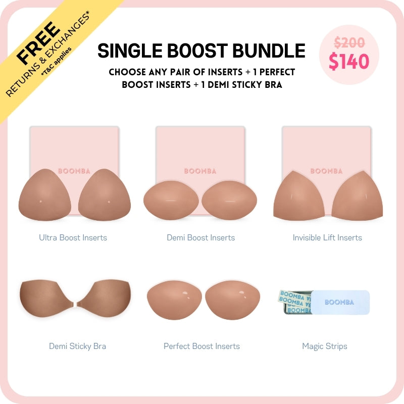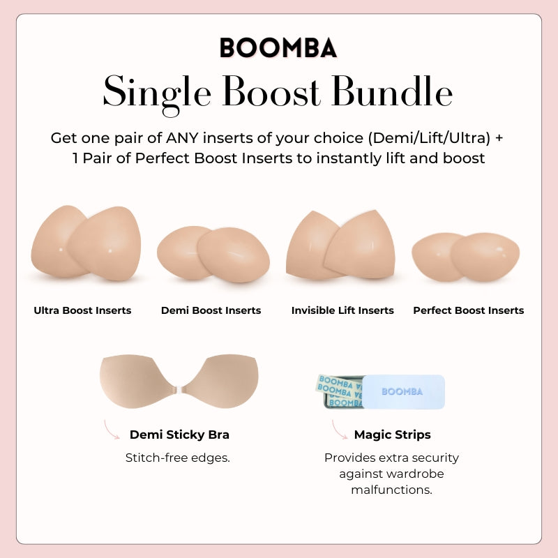 Meet your answer to an instantly elevated look. This bundle contains one pair of the newly launched Perfect Boost Insert that increases your cup size up to one cup, one pair of any BOOMBA inserts of your choice, one Demi Sticky Bra for stitch-free edges, and one tin of BOOMBA Magic Strips for your instant fashion.