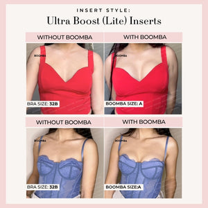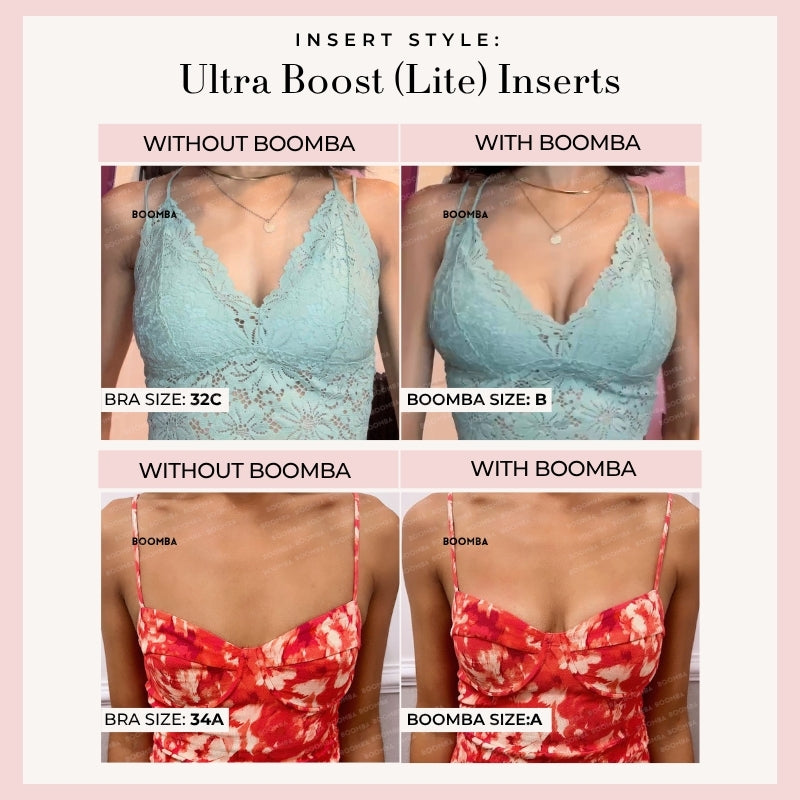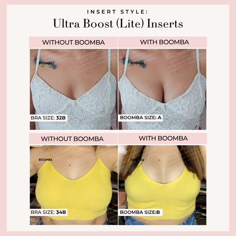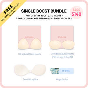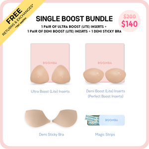 Looking for a natural-looking boost? Our Single Boost Bundle is made for you! Featuring the thinner versions of our best-selling Ultra Boost (Lite) and Demi Boost (Lite) Inserts. These Lite versions still deliver a noticeable lift and boost, just without the extra padding. Instantly add up to one cup size for a natural, everyday enhancement. Perfect for when you want a boost that’s low key but still high impact.