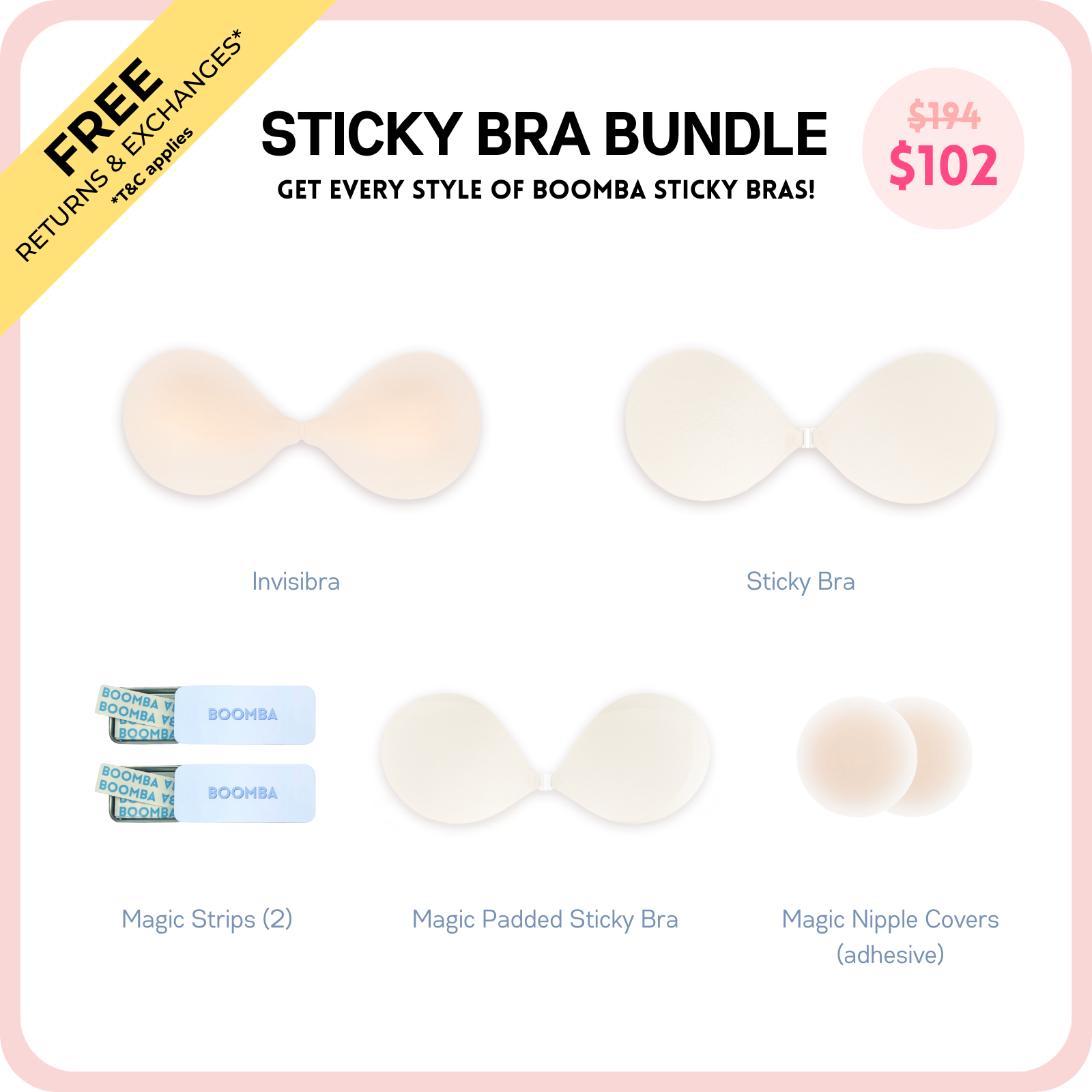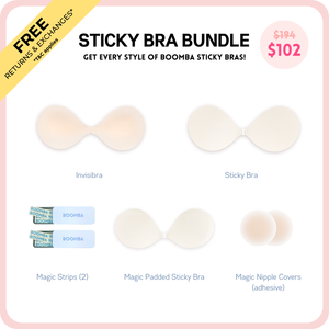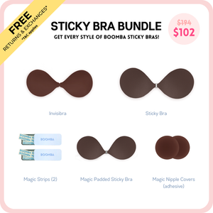 Be prepared for any outfit. This BOOMBA sticky bra bundle includes our best selling Invisibra, Sticky Bra AND our newest addition, the Magic Padded Sticky Bra! It also includes our famous Magic Nipple Covers, along with 2 tins of BOOMBA Magic Strips.