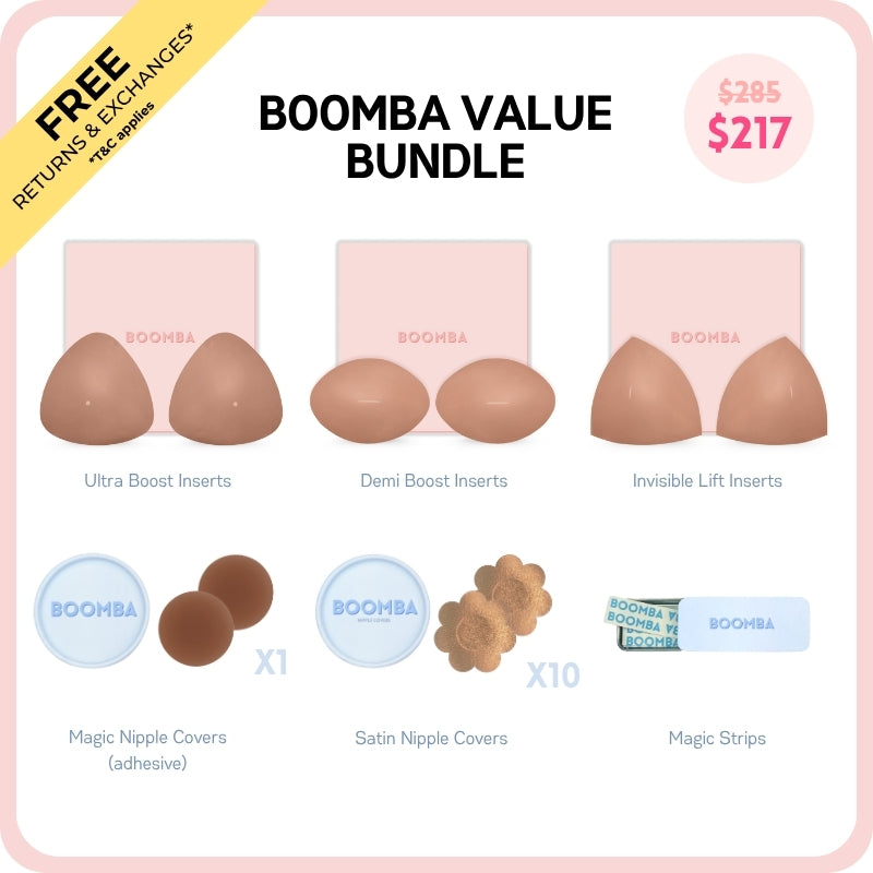 This bundle contains all three styles of our popular inserts, Ultra Boost, Demi Boost, and Invisible Lift. It also contains our best-selling Magic Nipple Covers (adhesive), Satin Nipple Covers, and BOOMBA Magic Strips.